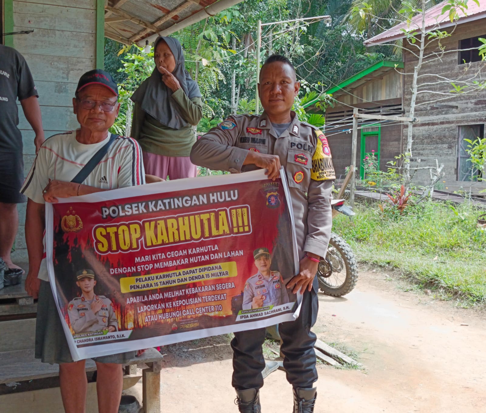 Polres Katingan – Salah satu cara Polsek Katingan Hulu, Polres Katingan, Polda Kalimantan Tengah dalam menangani Dampak KARHUTLA, Bhabinkamtias Brigpol Ulberto Tumalatoni polsek Katingan Hulu melaksanakan Sosialisasi STOP!!! KEJAHATAN TERHADAP LINGKUNGAN “DILARANG MEMBAKAR HUTAN DAN LAHAN DI WILKUM POLSEK KATINGAN HULU kepada masyarakat Desa Tumbang Mahop Kec Katingan Hulu, Kab. Katingan kegiatan,Kamis (25/09/2025) pagi.