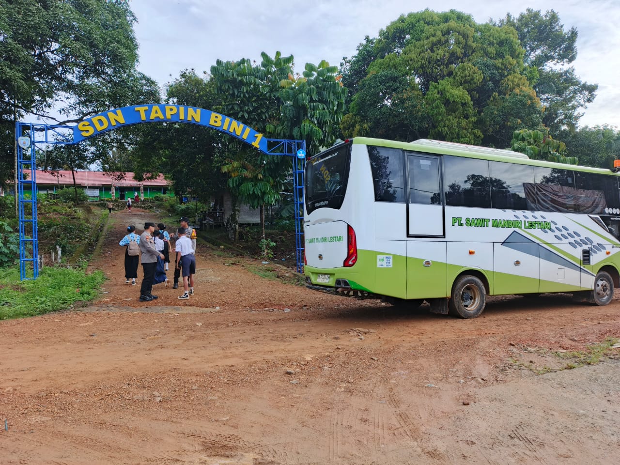 Seperti yang terlihat didepan Sekolah SDN 1 tapin bini kecamatan lamandau Brigpol Widyantoni Rajib beserta Bripda Etsa Anggota Jaga tampak tengah melaksanakan pengamanan /pengaturan Siswa Siswi SDN 1 tapin bini tersebut.