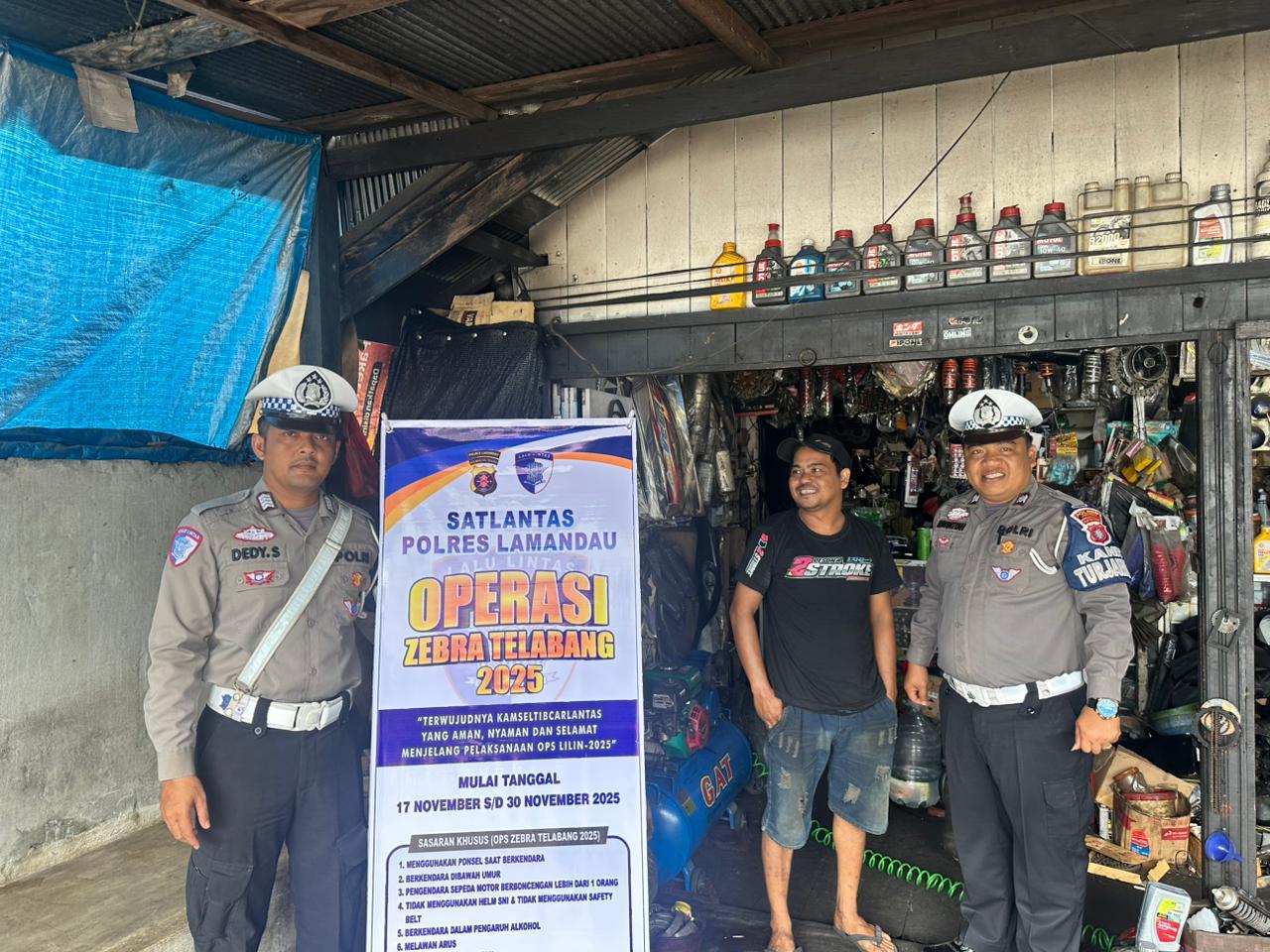 Lamandau — Satuan Lalu Lintas (Sat Lantas) Polres Lamandau melaksanakan kegiatan sosialisasi Operasi Zebra Telabang Tahun 2025 yang menyasar di Bengkel Motor Dua Bersaudara di Kecamatan Bulik, Jumat (21/11/25).