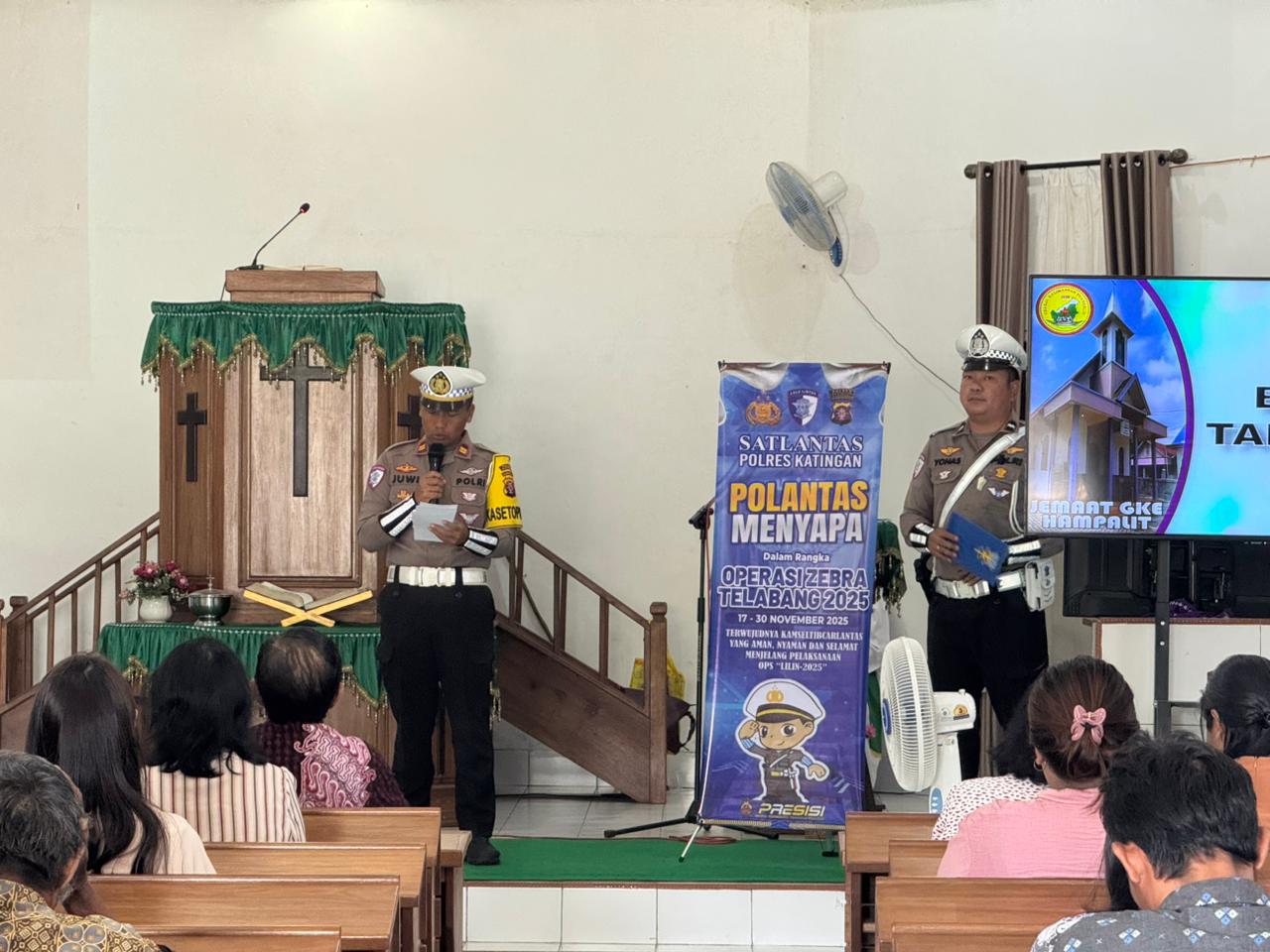 Polres Katingan-Dalam rangka mendukung pelaksanaan Operasi Zebra Telabang 2025, Satuan Lalu Lintas Polres Katingan melaksanakan kegiatan Polantas Menyapa yang dipimpin langsung oleh Kasat Lantas Polres Katingan IPTU JUWITO, S.E., M.M. Kegiatan ini berlangsung di tiga rumah ibadah, yaitu Gereja Gembala Desa Hampalit, Gereja Bukit Zaitun Desa Hampalit, serta Gereja Riwut Asi Kecamatan Katingan Hilir.