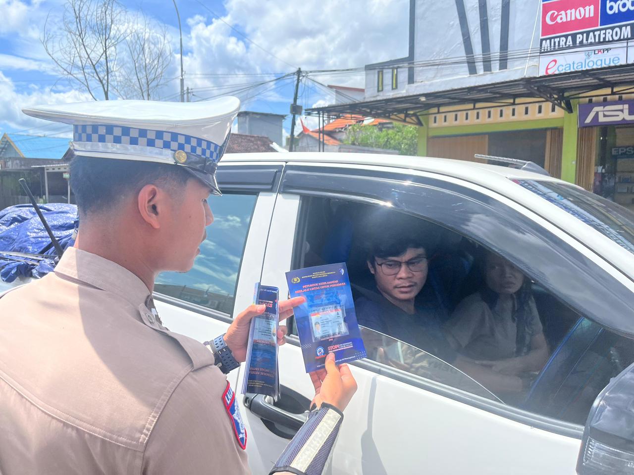 Personil Satlantas Polres Katingan sebagai anggota preemtif bergerak turun ke Jalan untuk meninformasikan kepada pengendara melalui pembagian brosur, untuk menciptakan keamanan dan keselamatan berlalu lintas.