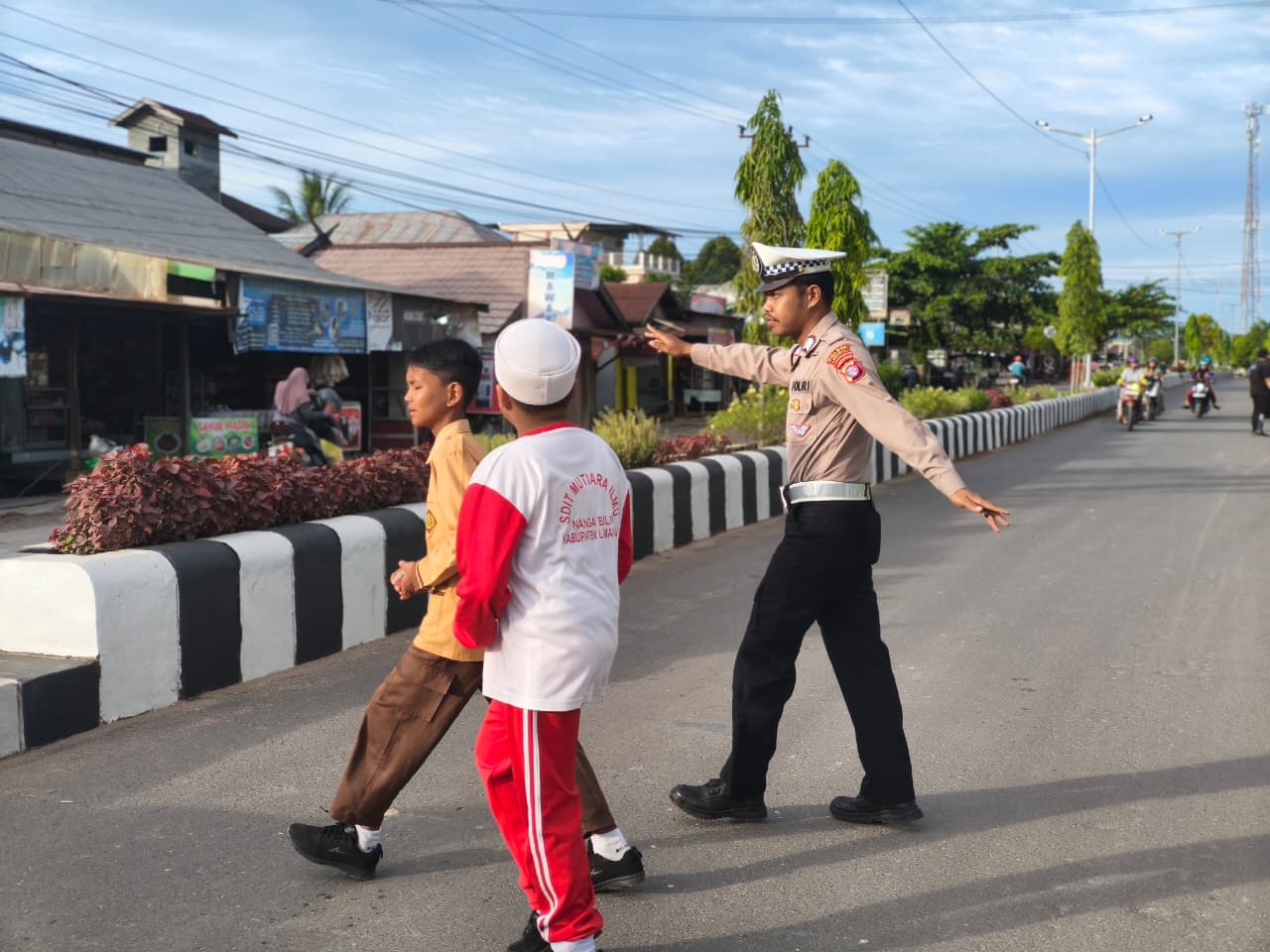 Personil Sat Lantas Lamandau Bantu Menyebrangkan Anak Sekolah